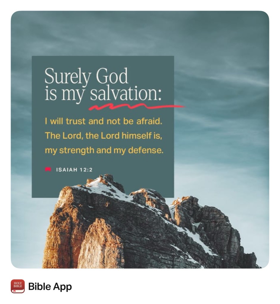 ”Surely God is my salvation; I will trust and not be afraid. The Lord, the Lord himself, is my strength and my defense; he has become my salvation.”“
